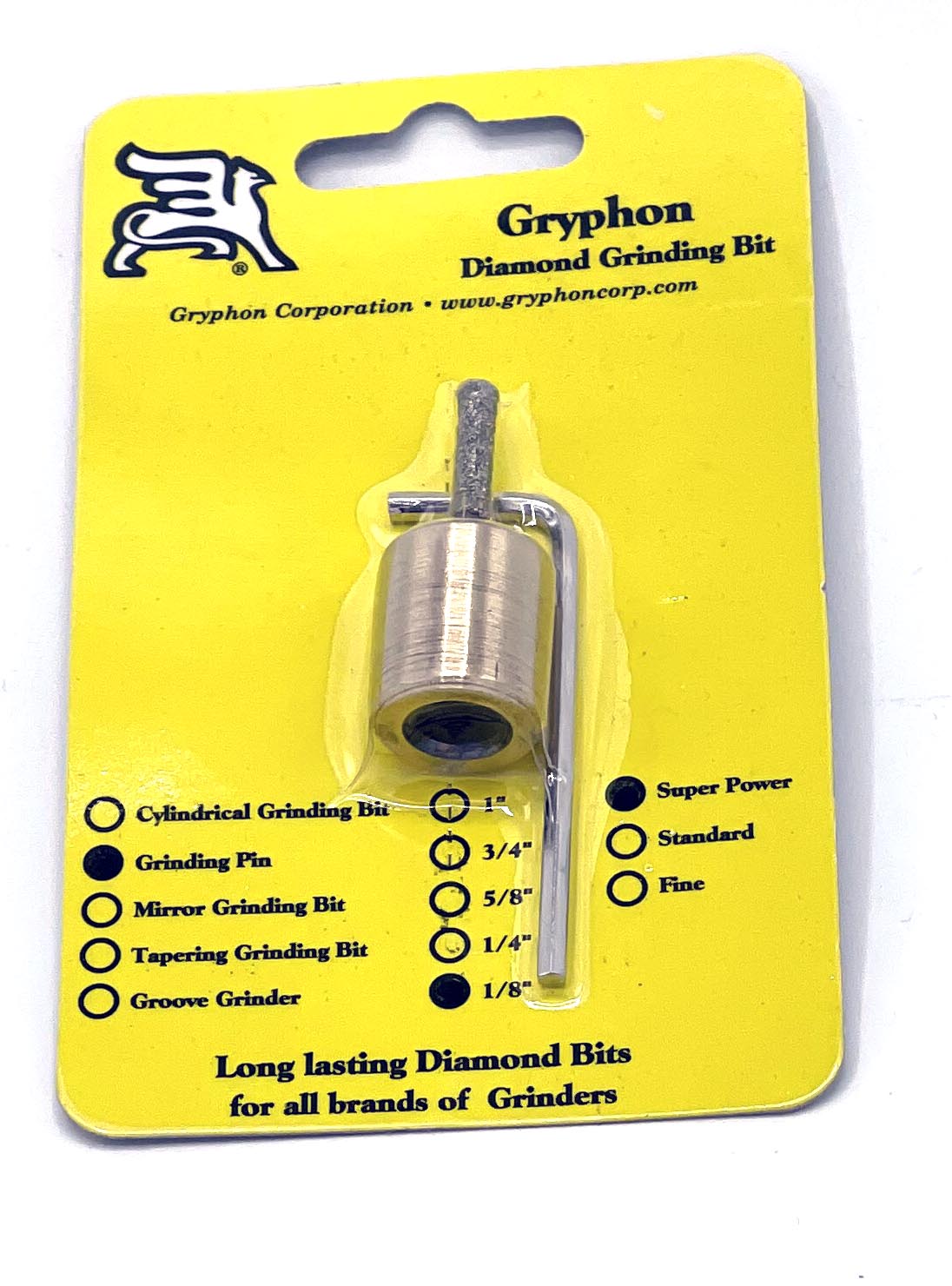 Grinding pins are available in 1/8” and 1/4” diameter in Fine, Standard and Super Power grades. These pins can be used for drilling small holes as well as for general grinding. In general grinding where a very tight curve is required, a grinding pin is often the only choice. Because the Grinding pins have diamond on the top face as well as the sides, they can be used to drill holes in glass. Once a hole is drilled, they can also provide fine grinding and elaborate shapes within the inner surface. Virtually unlimited shapes are possible by this technique.