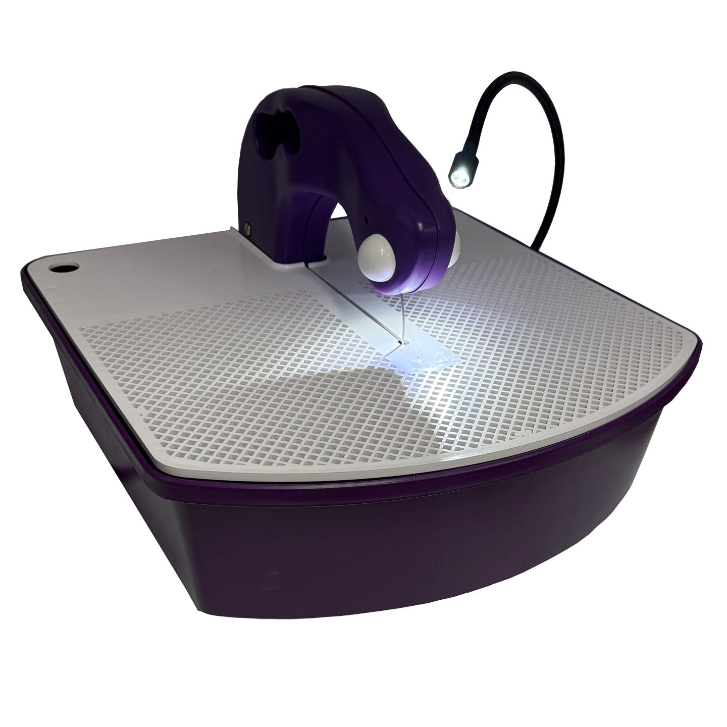 The motor/blade assembly is a separate unit that can be removed from the base and used as a hand-held saw. This is useful for cutting items that cannot easily be brought to the table. A small water reservoir is built into the blade assembly housing and will hold enough water for a few minutes of hand-held cutting. When the saw is used in the normal configuration (installed in the base), the base will hold enough water for several hours of cutting.